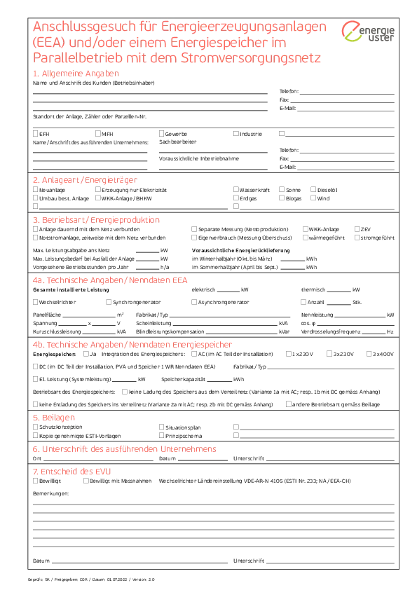 Anschlussgesuch für Energieerzeugungsanlagen und/oder Energiespeicher Elektrizität