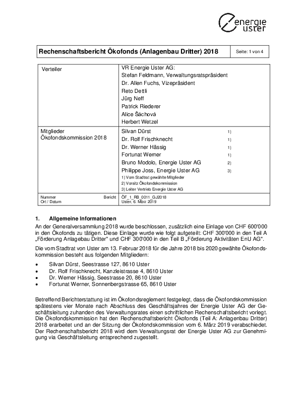 Rechenschaftsbericht Ökofonds (Anlagenbau Dritter) 2018