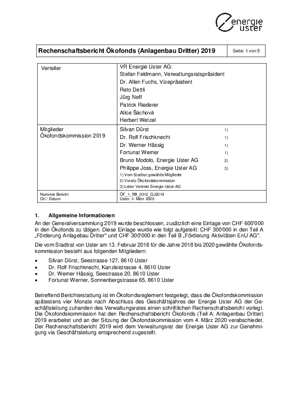 Rechenschaftsbericht Ökofonds (Anlagenbau Dritter) 2019