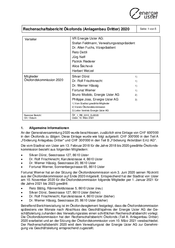 Rechenschaftsbericht Ökofonds (Anlagenbau Dritter) 2020