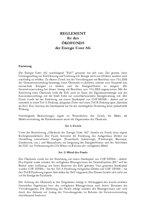 Reglement für den Ökofonds der Energie Uster AG