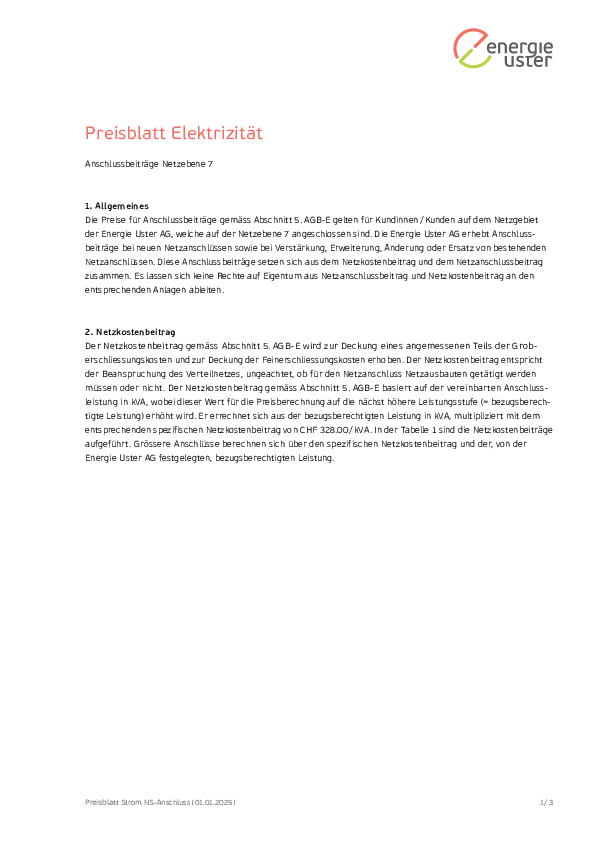 Preisblatt Elektrizität – Anschlussbeiträge Netzebene 7 (230/400V) (gültig ab 01.01.2025)