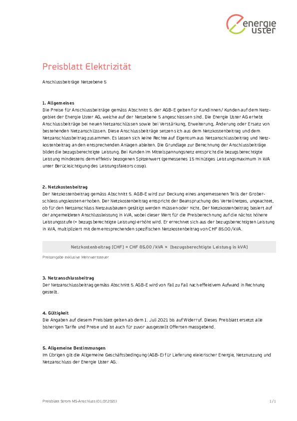 Preisblatt Elektrizität – Anschlussbeiträge Netzebene 5 (16‘000V)