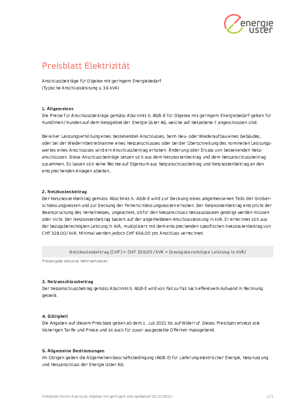 Preisblatt Elektrizität – Anschlussbeiträge für Objekte mit geringem Energiebedarf