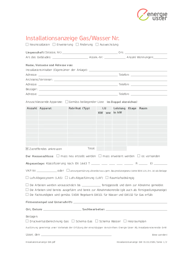 Installationsanzeige Gas / Wasser