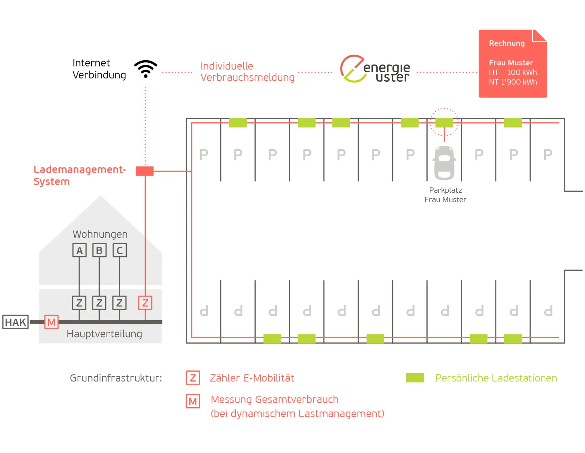 Werden mehr als zwei Ladestationen in einer Tiefgarage angeschlossen (Summe der installierten Leistung > 22 kW), ist zusätzlich ein sogenanntes Lastmanagement notwendig. Dieses System steuert die Ladestationen und verhindert eine Überlastung des Hausanschlusses. Insbesondere dann, wenn mehrere Nutzer*innen gleichzeitig ihr E-Auto laden.