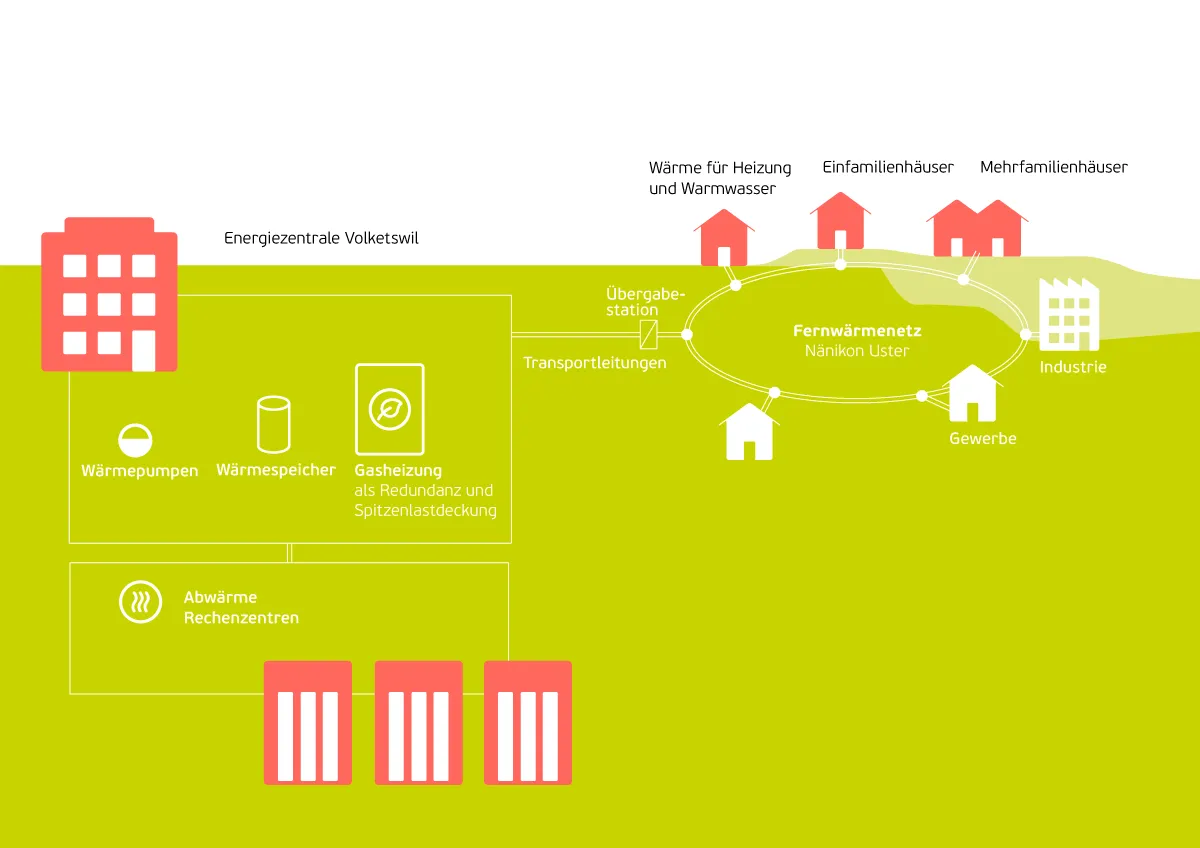 Das schweizweit tätige Unternehmen Energie 360° baut in Volketswil eine neue Energiezentrale, um die Gemeinden Volketswil, Greifensee, Schwerzenbach und Effretikon mit Energie aus der Abwärme des Rechenzenter Campus von Vantage zu versorgen. Das Abwärmepotenzial der Rechenzenter ist gross genug, um auch Nänikon und Teile von Uster mit erneuerbarer Energie zu beliefern. Mithilfe von Wärmetauschern wird der Abwärme die Energie entzogen und auf einen Wasserkreislauf übertragen. Anschliessend sorgen Wärmepumpen dafür, dass die Fernwärme die zum Heizen benötigte Temperatur erreicht. An besonders kalten Tagen decken Gaskessel die Spitzenlast ab.