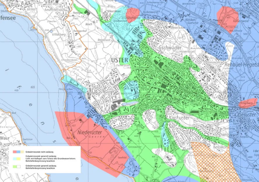 - Der Anschluss an einen Wärmeverbund ist in Uster nicht überall möglich (weitere Gebiete sind bereits in Planung).